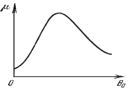от В0 и формы железного тела. Изучением того, как зависит До его исследований было известно, что при больших величинах индукции намагничивающего поля магнитная проницаемость падает с ростом В0. В слабых полях ее поведение не изучалось. Начав опыты, Столетов обнаружил поразительный факт: при слабых полях с ростом В0 величина не постоянна, а быстро возрастает, достигает максимума при некотором значении В0 и медленно убывает. Причем максимальное значение
